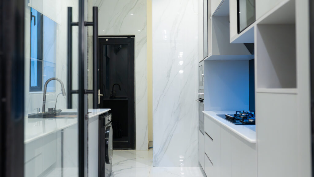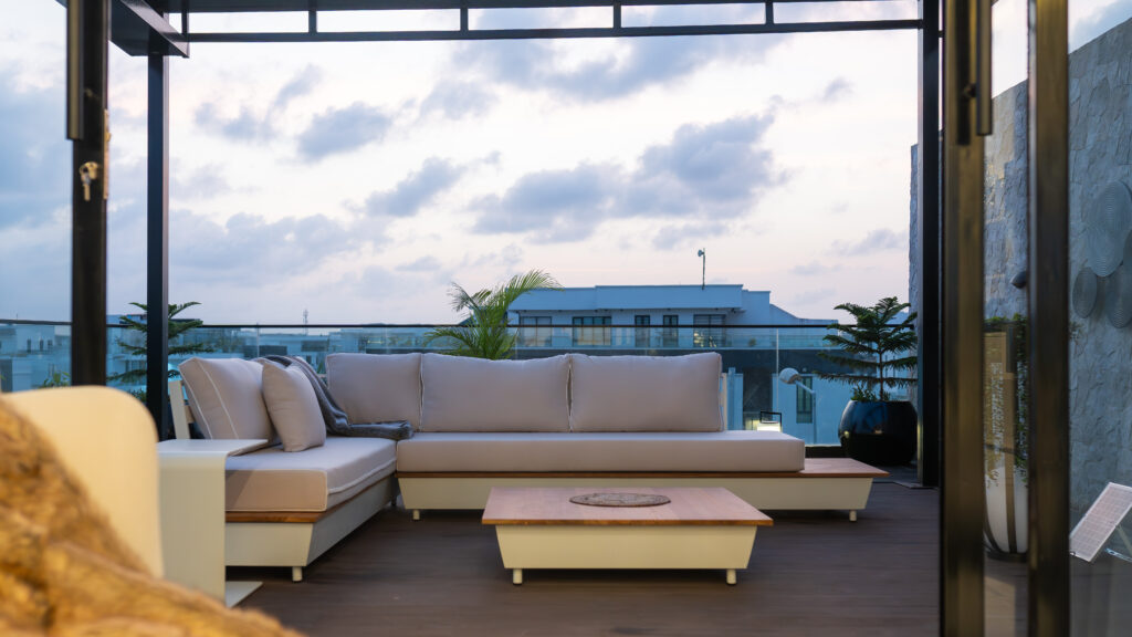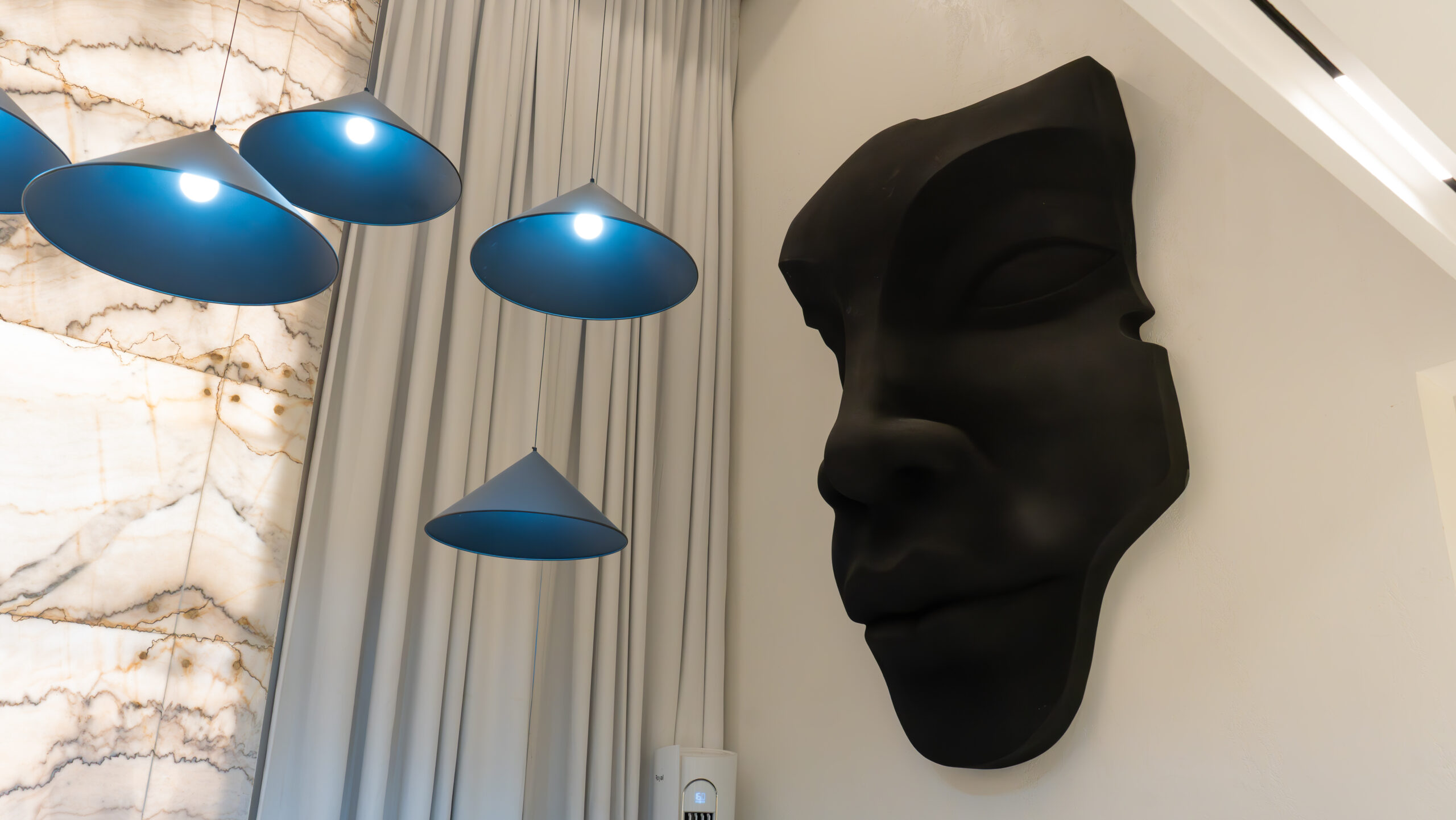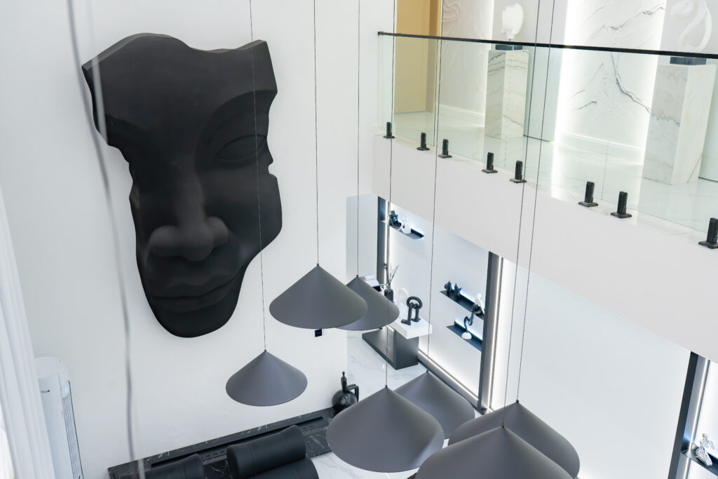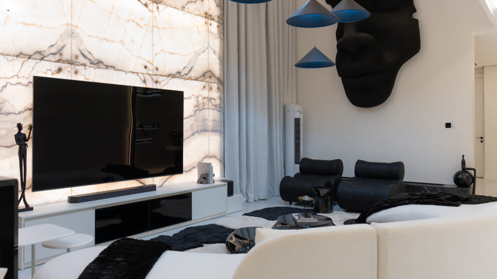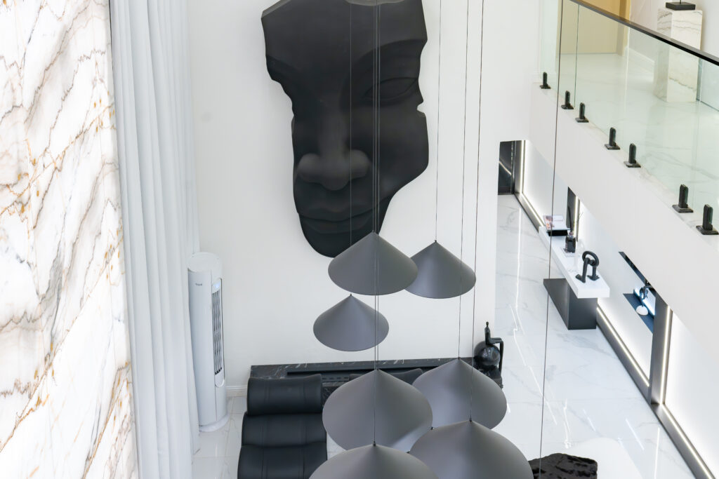 At the heart of the home is a dramatic double-height living space, anchored by a one-of-a-kind, double-height onyx TV wall a rare architectural installation at this scale in Lagos. The onyx responds dynamically to light throughout the day, introducing depth, movement, and a quiet sense of luxury that evolves with time. Complementing this is a handmade, oversized 10-foot sculptural face artwork, carefully proportioned to the vertical volume of the space, creating a powerful yet restrained dialogue between art and architecture.