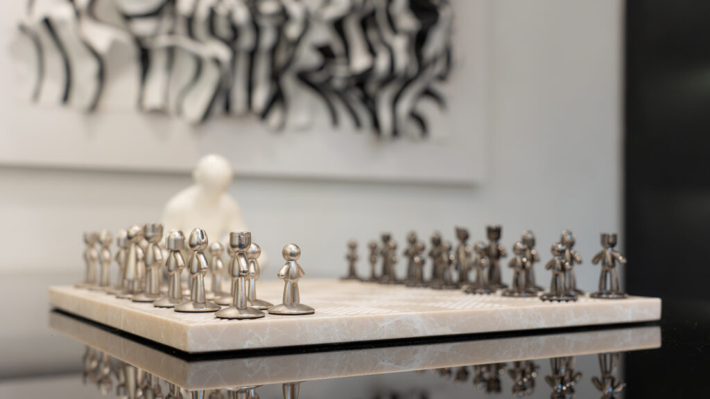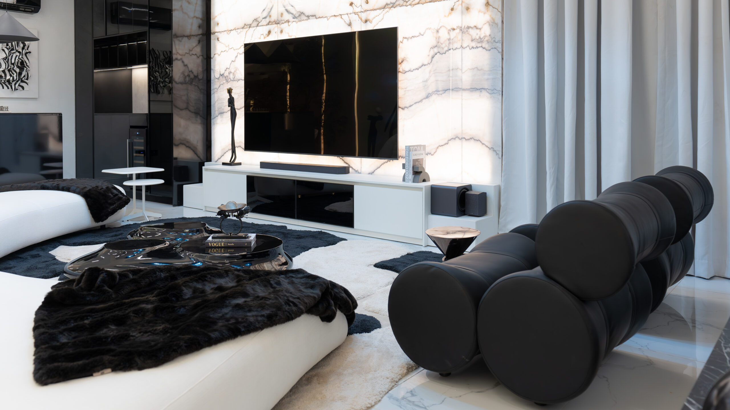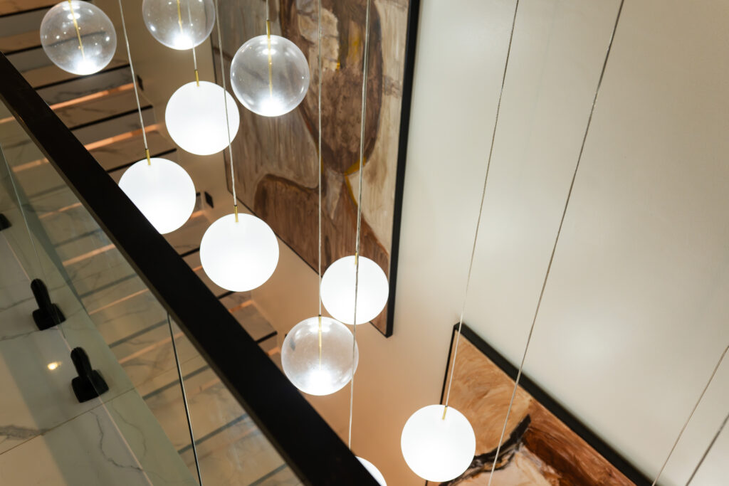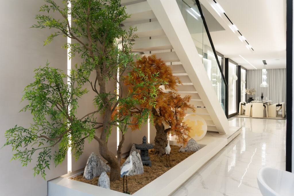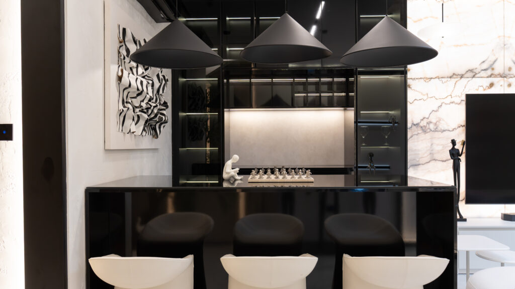 The living experience is conceived as a continuous composition, incorporating an anteroom, integrated living room bar, and a custom under-stairs sculptural landscape. Rather than treating secondary areas as residual spaces, each zone is designed as part of the overall architectural narrative, adding rhythm, texture, and visual balance.