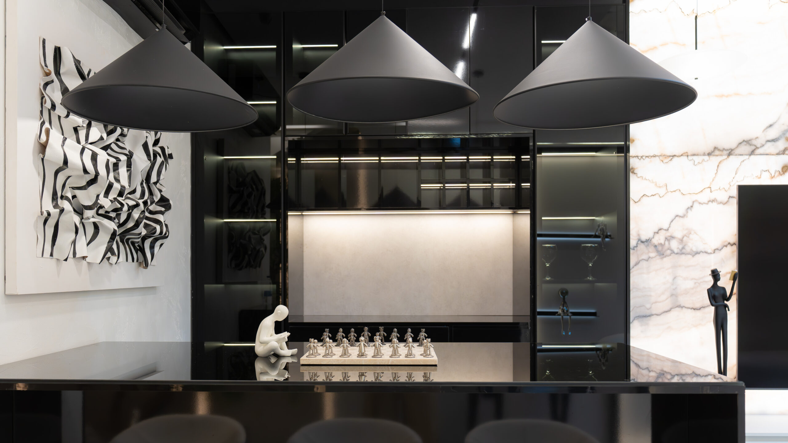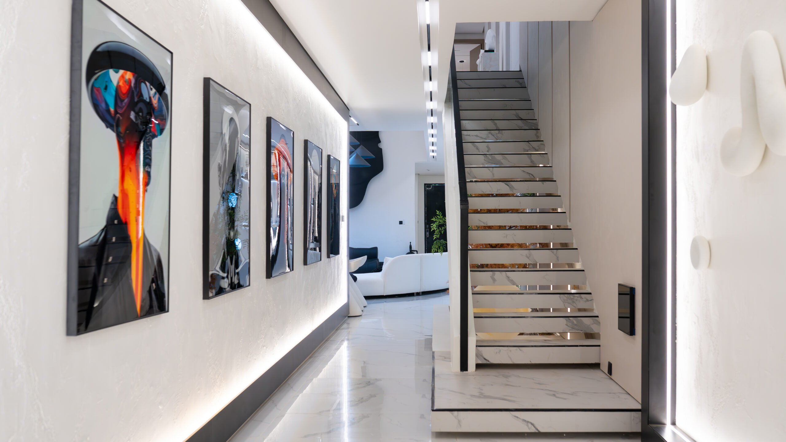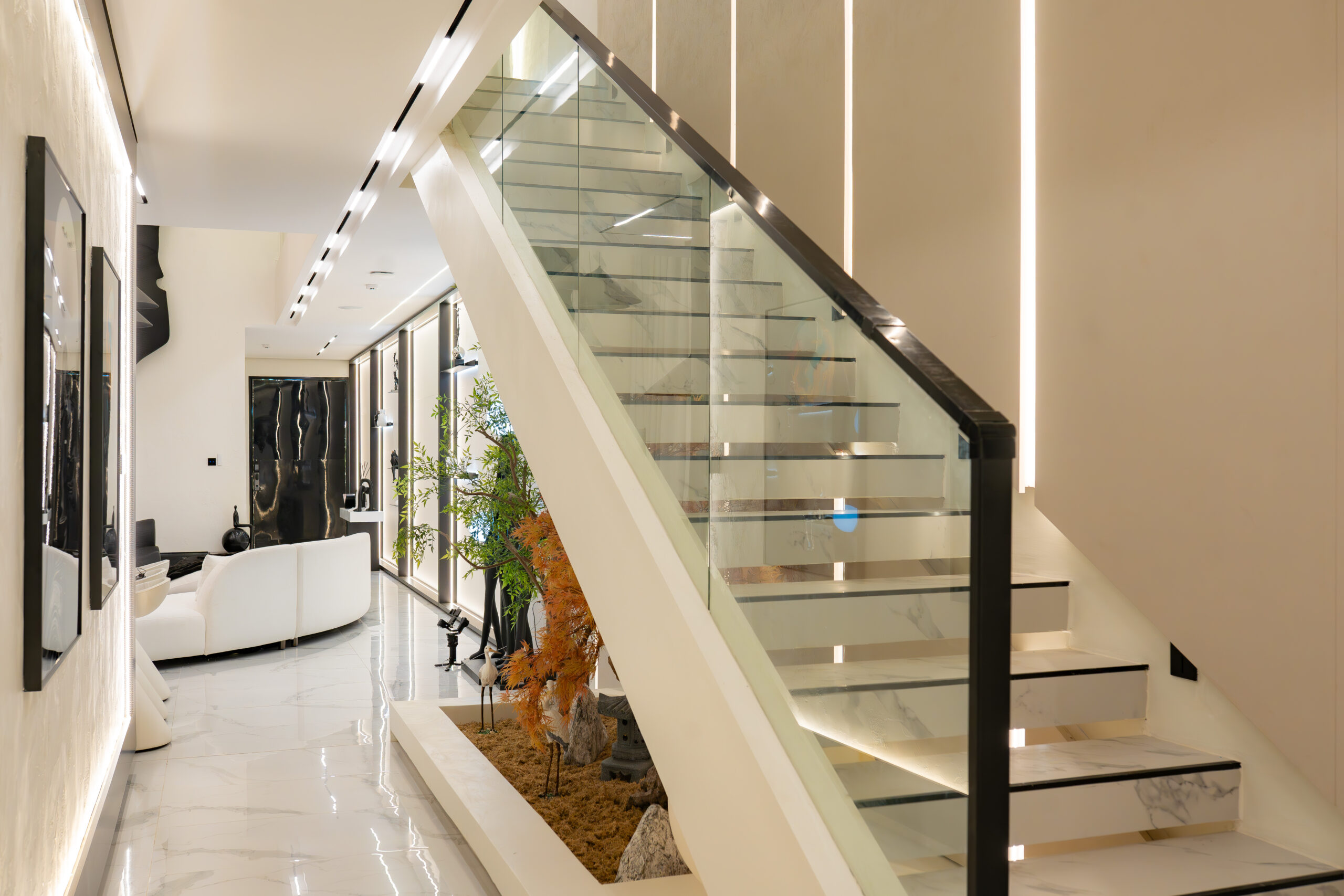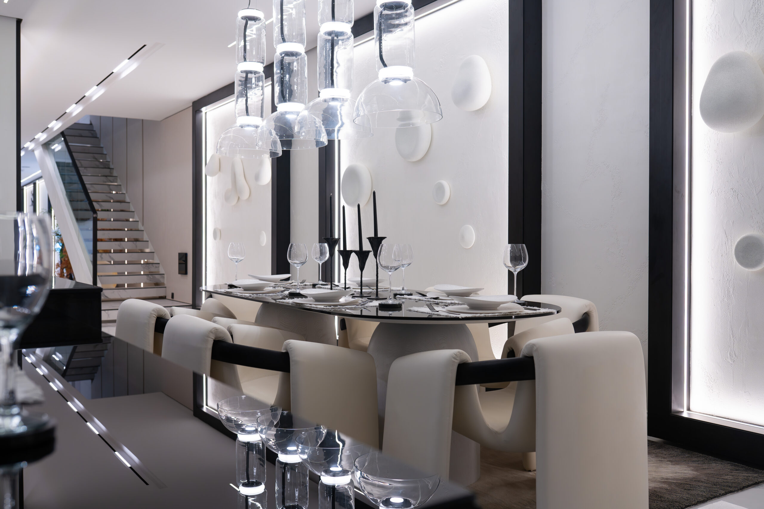 The living experience is conceived as a continuous composition, incorporating an anteroom, integrated living room bar, and a custom under-stairs sculptural landscape. Rather than treating secondary areas as residual spaces, each zone is designed as part of the overall architectural narrative, adding rhythm, texture, and visual balance.