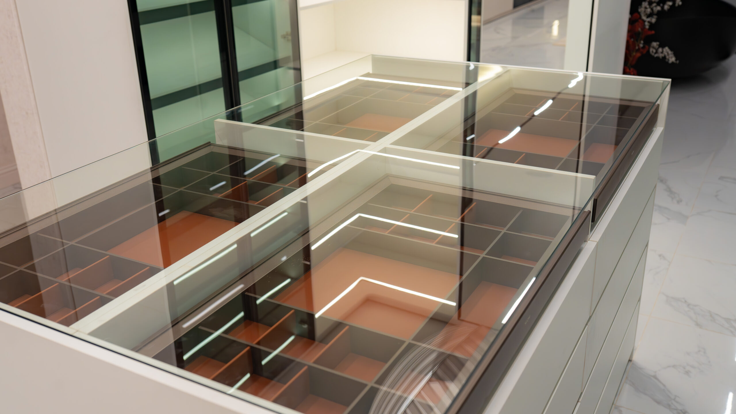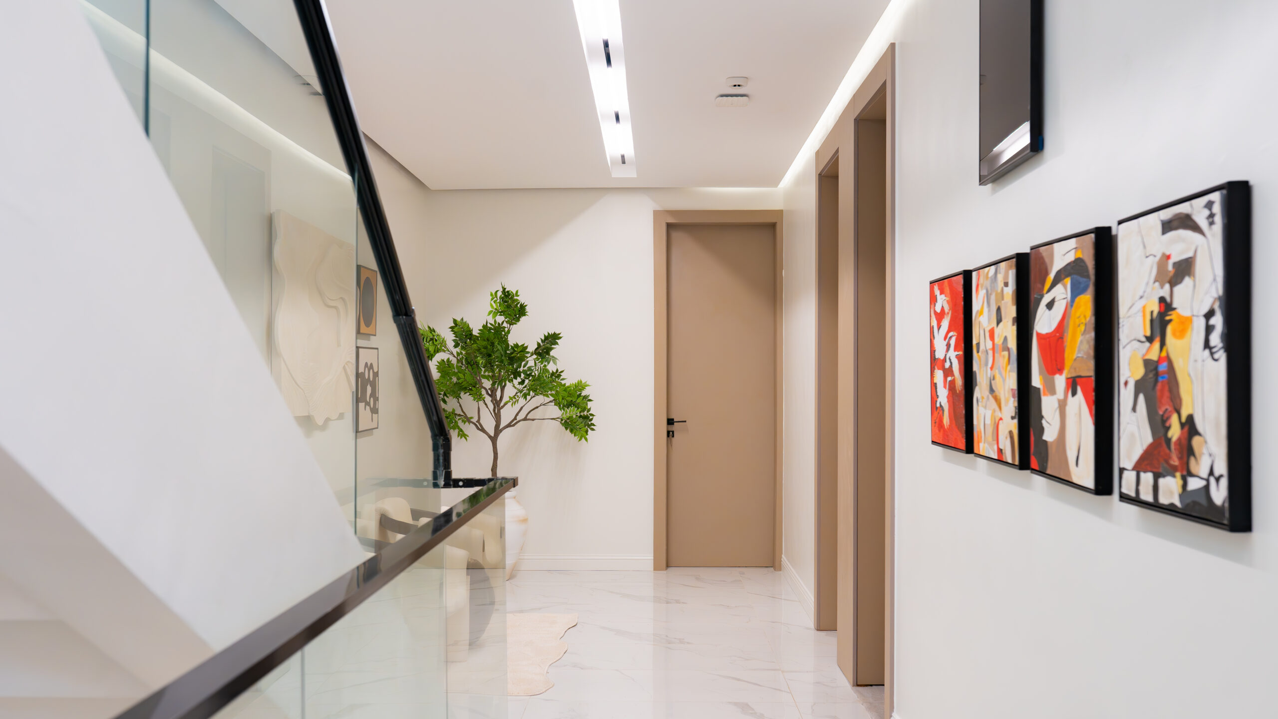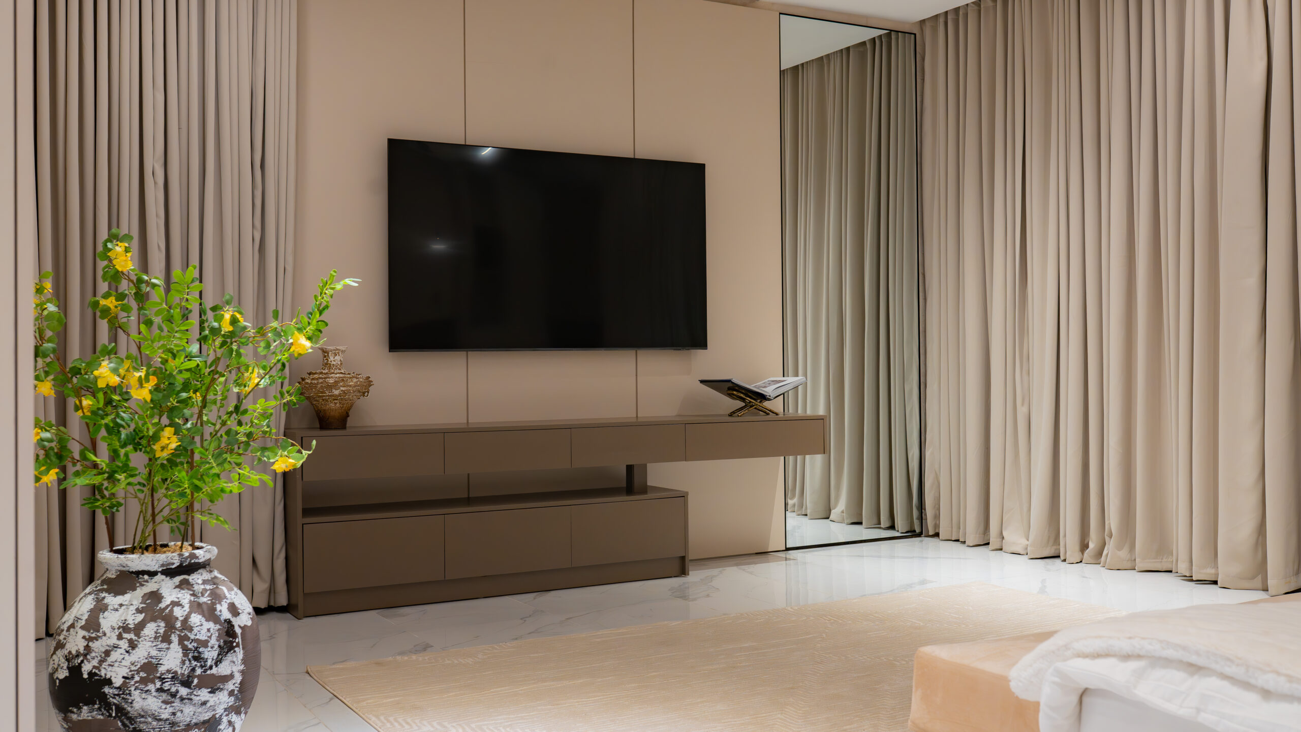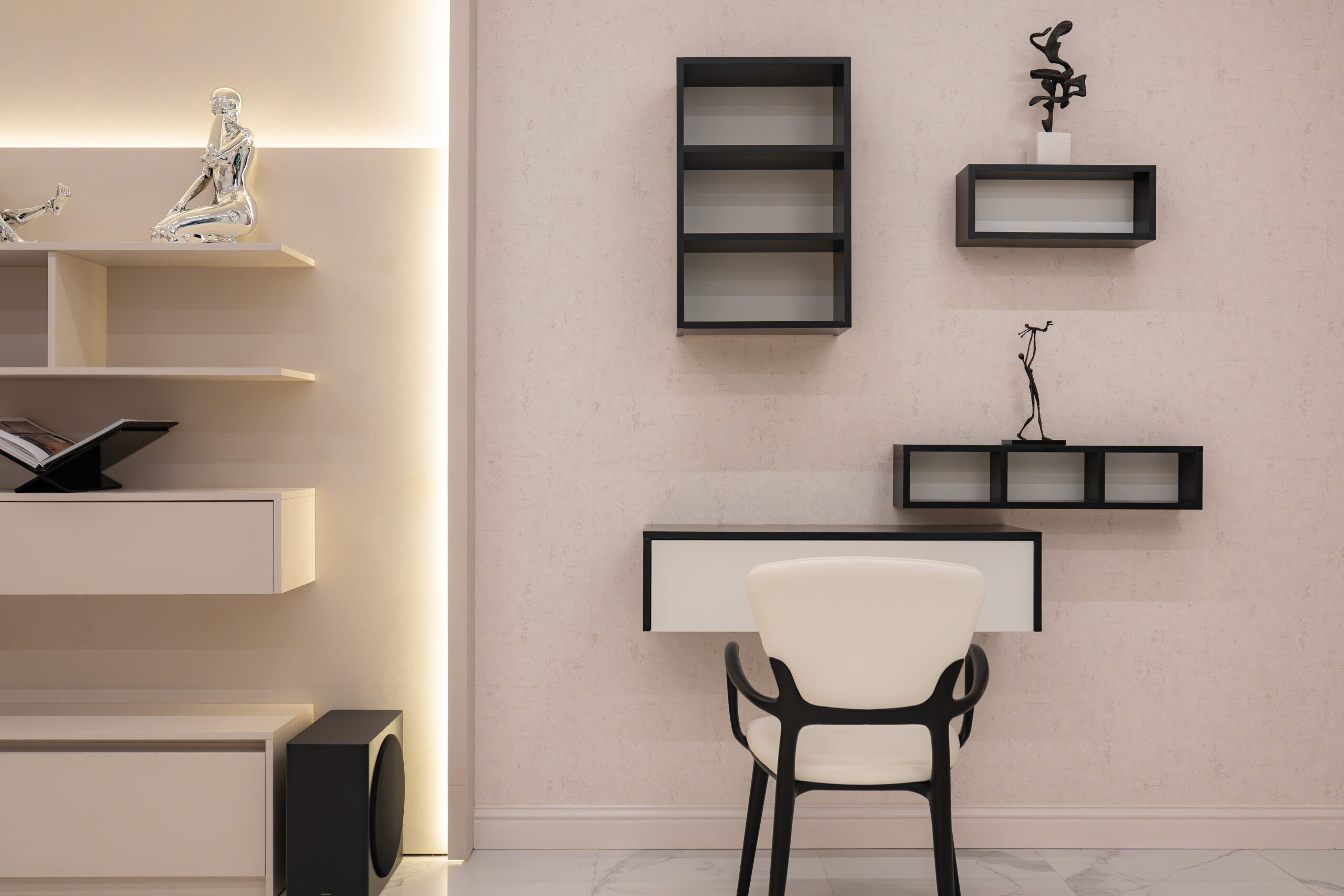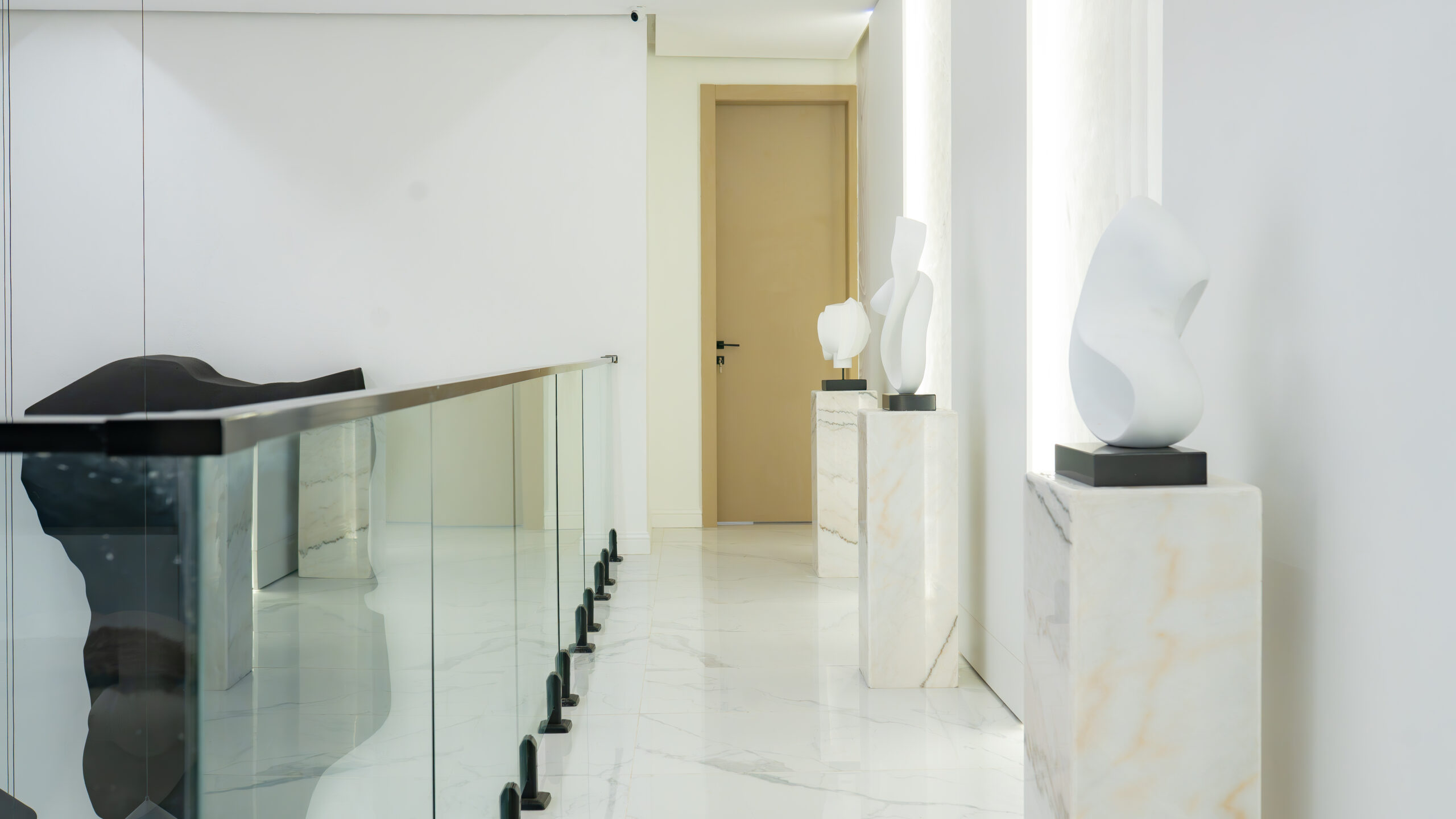 The living experience is conceived as a continuous composition, incorporating an anteroom, integrated living room bar, and a custom under-stairs sculptural landscape. Rather than treating secondary areas as residual spaces, each zone is designed as part of the overall architectural narrative, adding rhythm, texture, and visual balance.