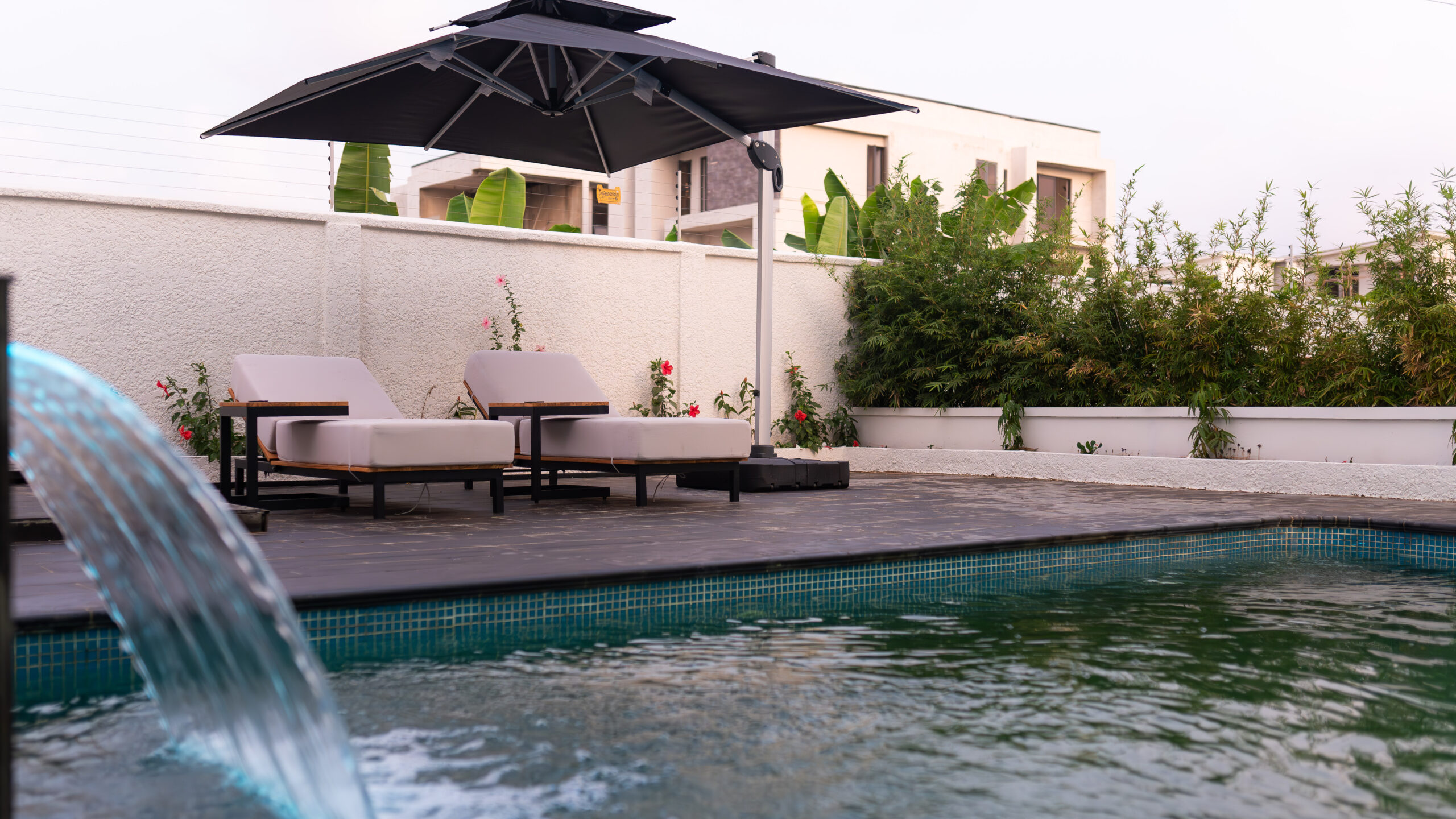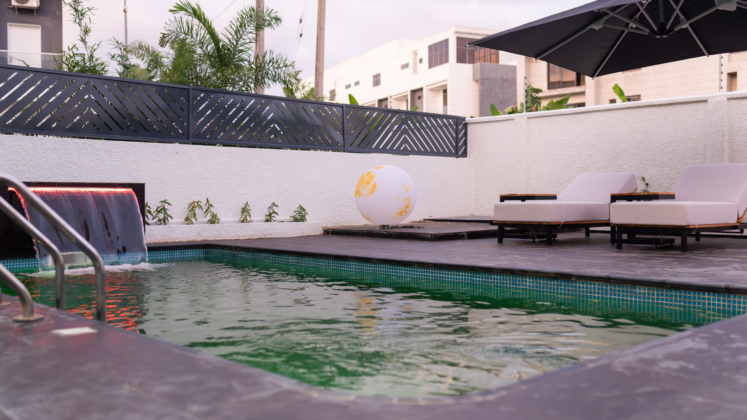 At the heart of the home is a dramatic double-height living space, anchored by a one-of-a-kind, double-height onyx TV wall a rare architectural installation at this scale in Lagos. The onyx responds dynamically to light throughout the day, introducing depth, movement, and a quiet sense of luxury that evolves with time. Complementing this is a handmade, oversized 10-foot sculptural face artwork, carefully proportioned to the vertical volume of the space, creating a powerful yet restrained dialogue between art and architecture.